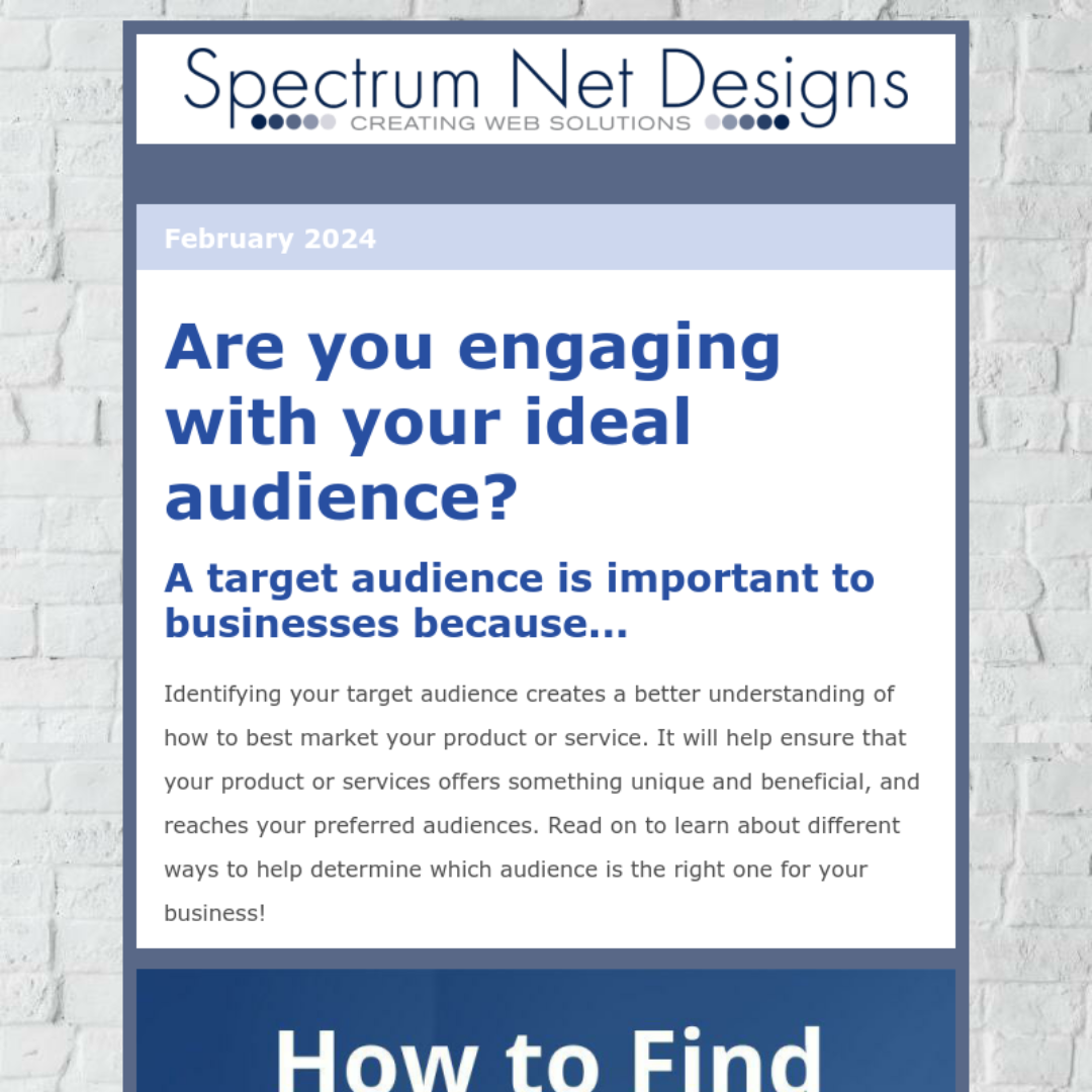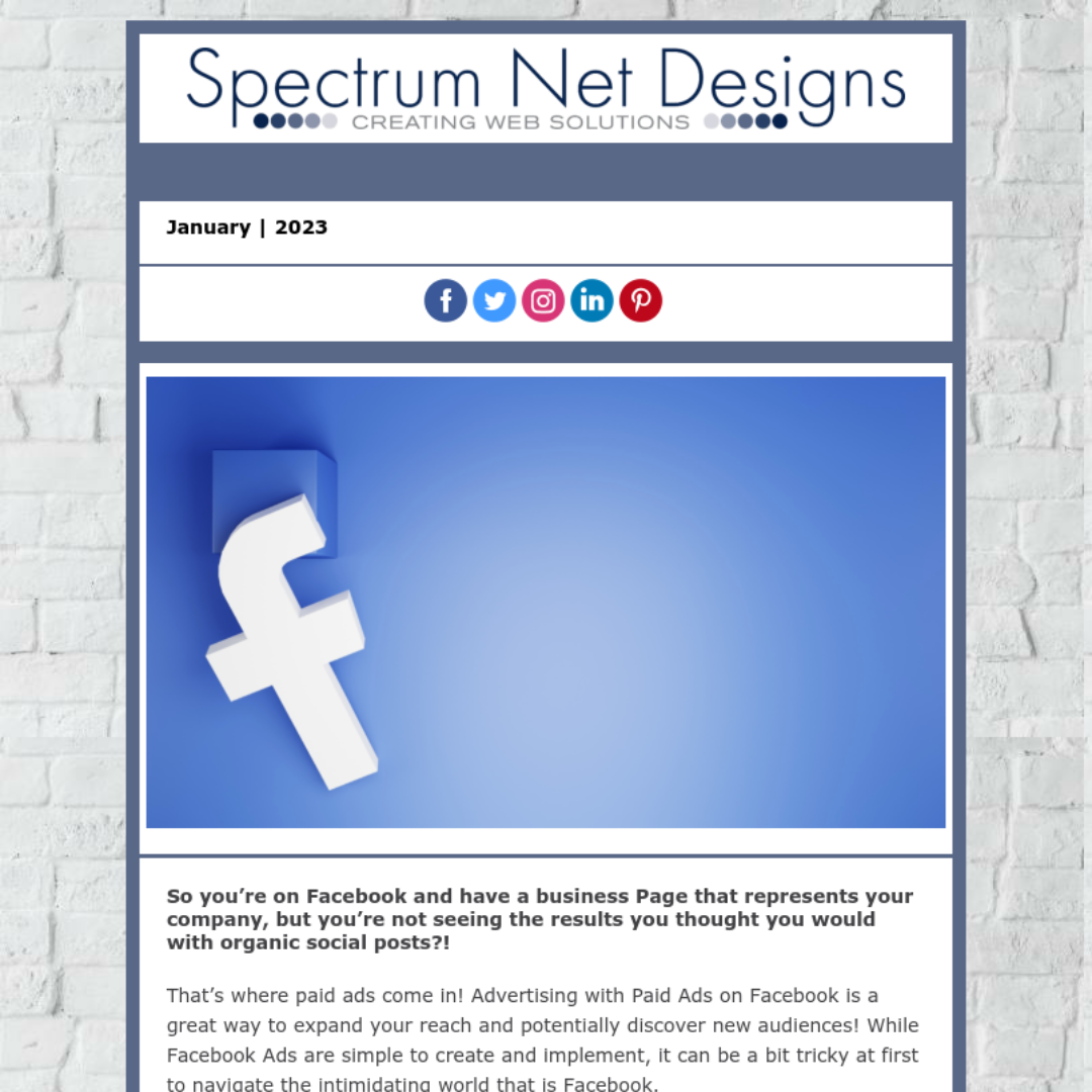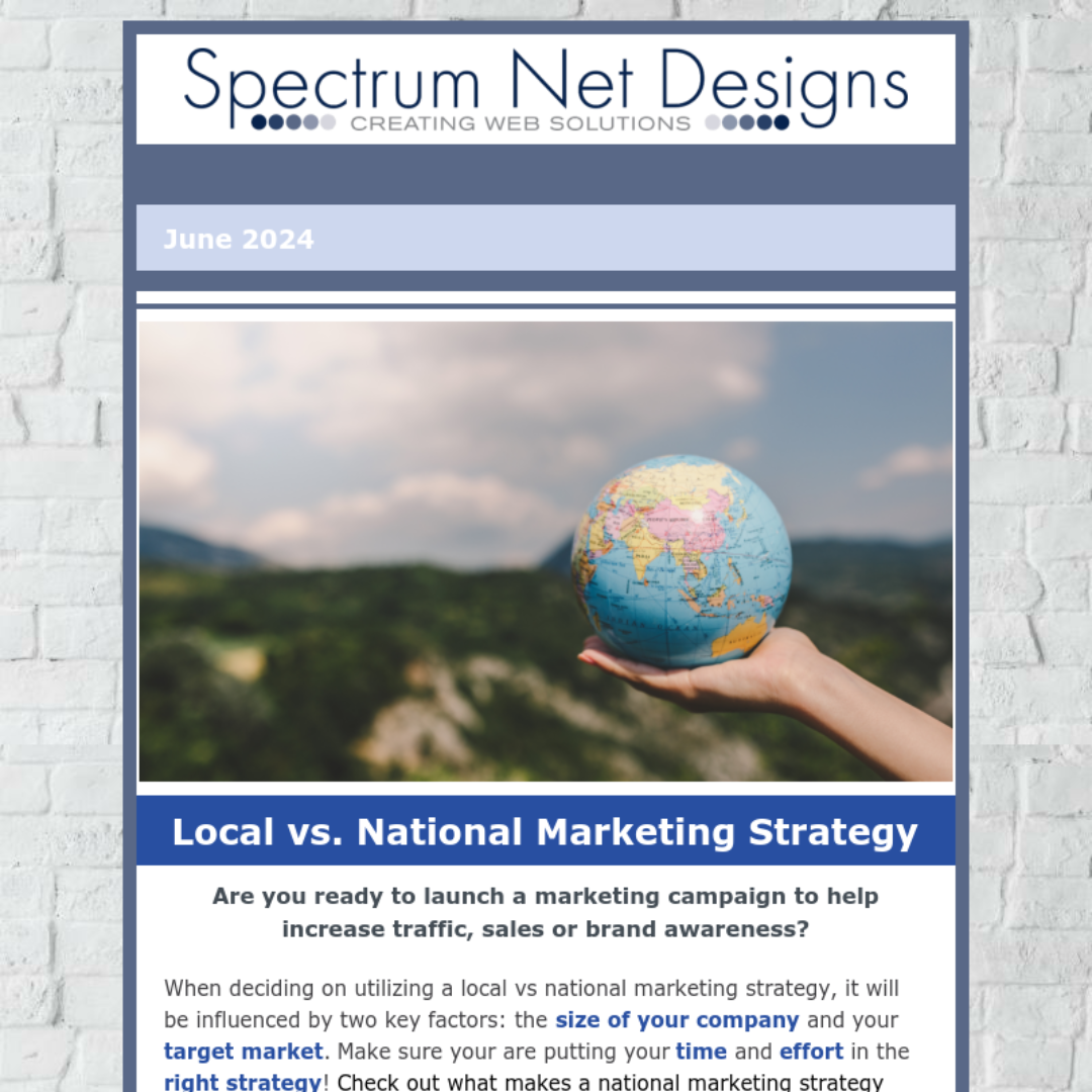 All across the country, students are headed back to school – online, in-person, or some combination of the two. Back to school is always so much fun. New classes, new supplies, and new things to learn. Just because you aren’t in school anymore doesn’t mean that you stop learning! Spectrum Net Designs is taking you back to marketing school in our next few newsletters! Stay tuned as we share our marketing knowledge with you. Class is in session!