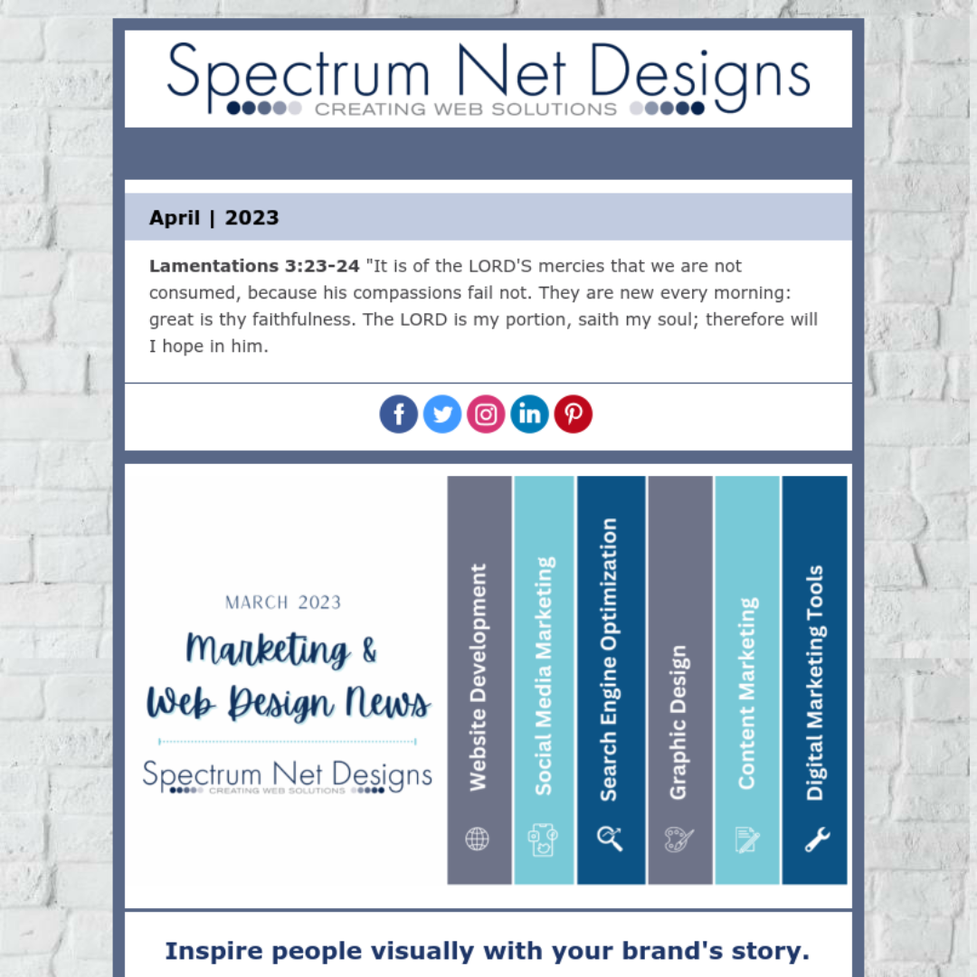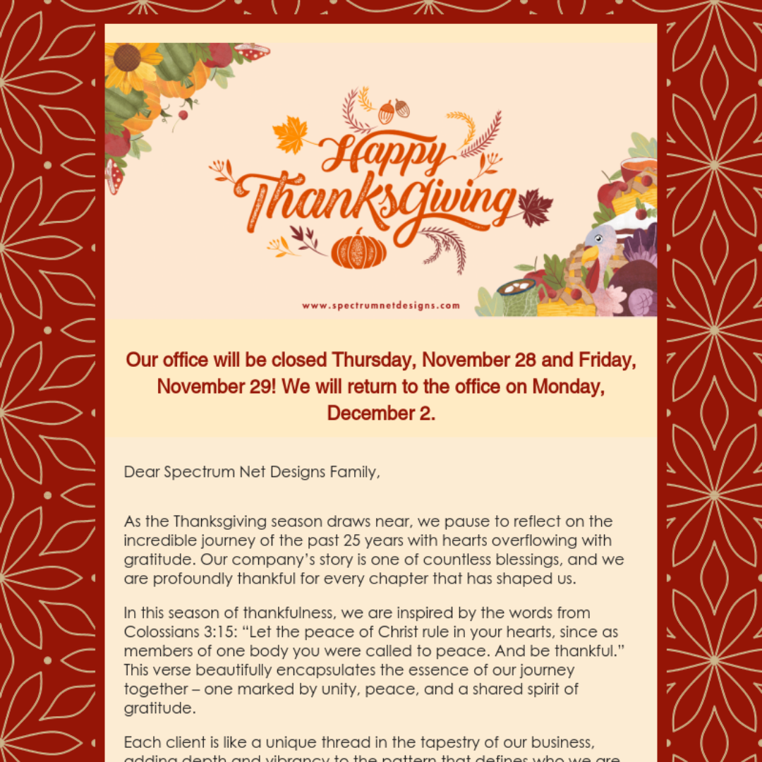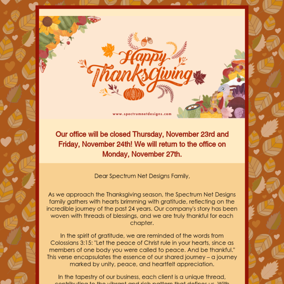 It has been an incredible 23 years since we opened our doors at Spectrum Net Designs, Inc. Throughout the years, the Lord has continued to bless us with many great clients, relationships, increased growth opportunities, an excellent staff, and a positive company
