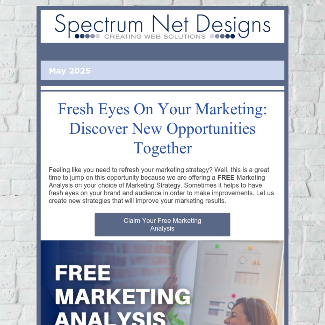 Feeling like you need to refresh your marketing strategy? Well, this is a great time to jump on this opportunity because we are offering a FREE Marketing Analysis on your choice of Marketing Strategy. Sometimes it helps to have fresh eyes on your brand and audience in order to make improvements. Let us create new strategies that will improve your marketing results.